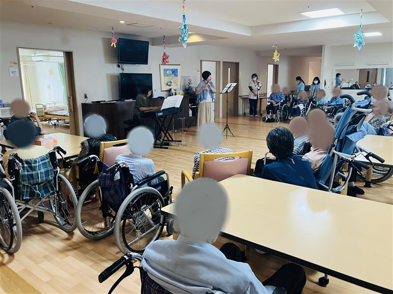 当日は多くの入所者さんにご参加いただき、間近で生演奏を楽しんでいただけました。演奏はしっかりと響き、難聴の方にも比較的聞き取りやすかったのではないかと思います。