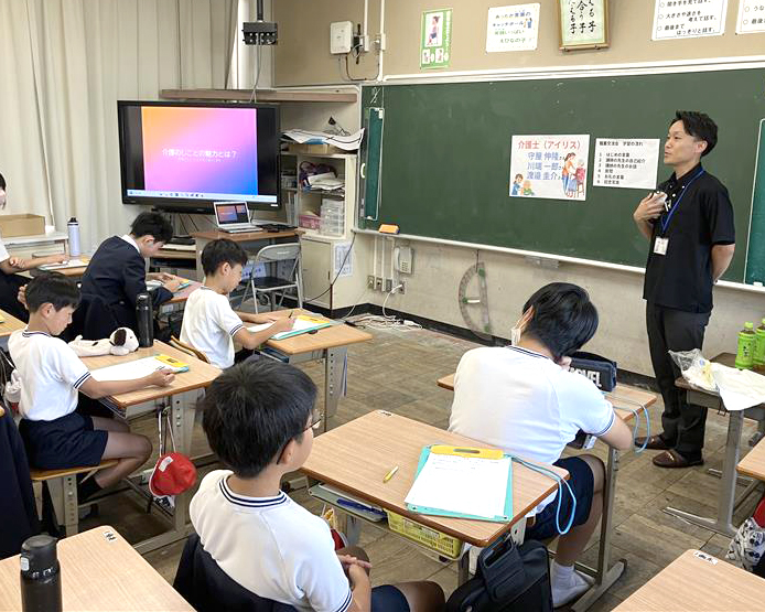 テーマは「介護の仕事について~その魅力~」。45分×2コマの授業を通じて、介護やリハビリ、ケアマネージャーの仕事内容について説明を行いました。質疑応答や体験コーナーも設けられ、児童たちとの活発な交流が生まれました。
